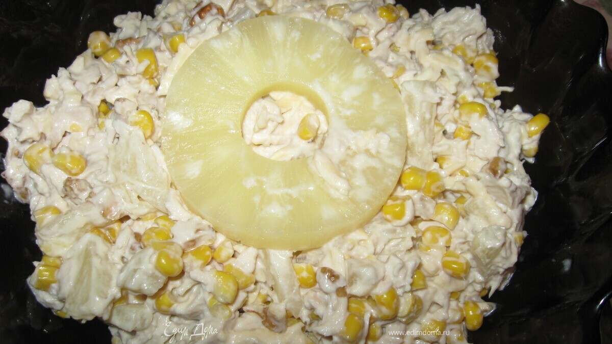 - Шаг 2Все ингредиенты смешать. Добавить маринованую кукурузу, майонез по вкусу и приправу Карри. Всё тщательно перемешать и украсить оставшимся кольцом ананаса. Дать напитться и подавать на стол. Приятноо аппитита.