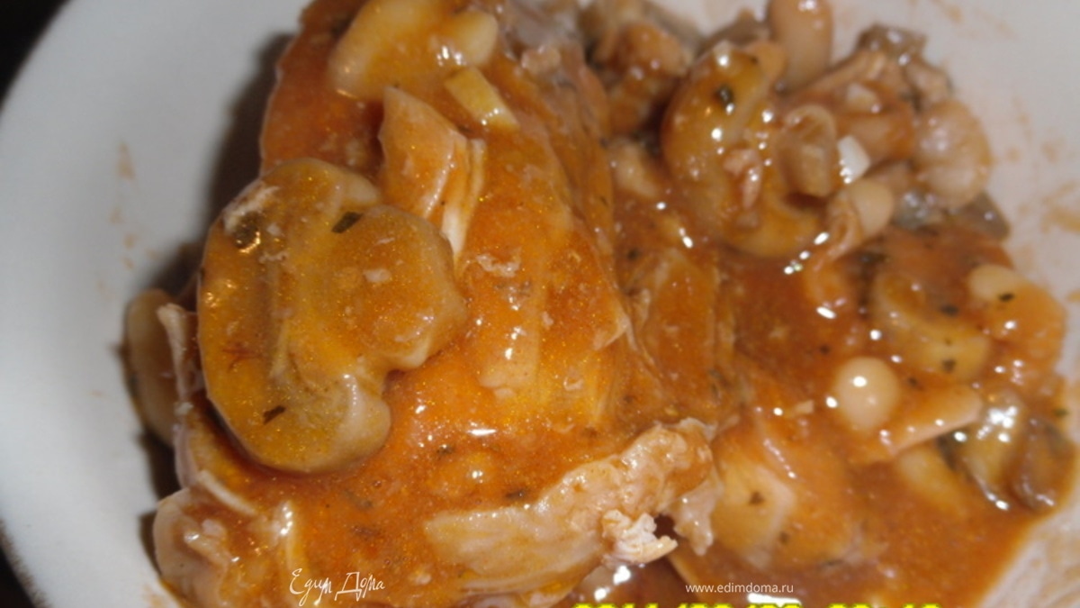 В утятнице потушить мясо в соевом соусе разбавленном.Достать мясо и в жире от мяса потушить шампиньоны, добавить фасоль, томатную пасту.Немного подтушить. - Шаг 2