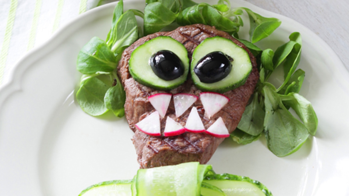 - Шаг 1Мясо отбейте с помощью молотка для отбивания, обмакните в оливковое масло и пожарьте на сковороде-гриль до готовности. Огурец нарежьте длинными и тонкими ломтиками (можно воспользоваться овощечисткой). Из получившихся ломтиков огурца сложите бант, как показано на картинке. Выложите стейк на тарелку, снизу украсьте огуречным бантом. Сделайте волосы из листьев салата, а с помощью редиса и маслин сделайте рот и глаза. Настроение человечку из стейка можно делать разное, например можно вырезать из редиса острые зубы и сделать монстрика.