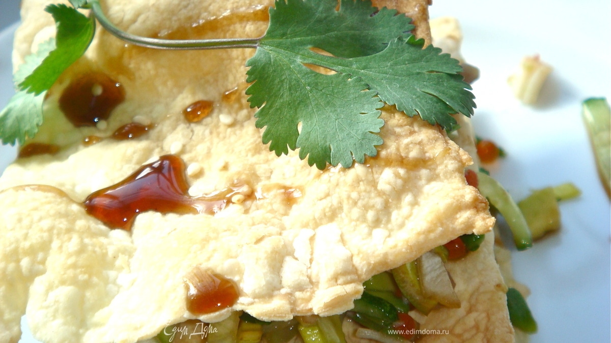 Огурец нарезать соломкой, авокадо, кинзу, мяту и лук-порей нарезать мелко, мясо краба разобрать с помощью вилки. Заправить соевым соусом и кунжутным маслом и добавить икру. - Шаг 3