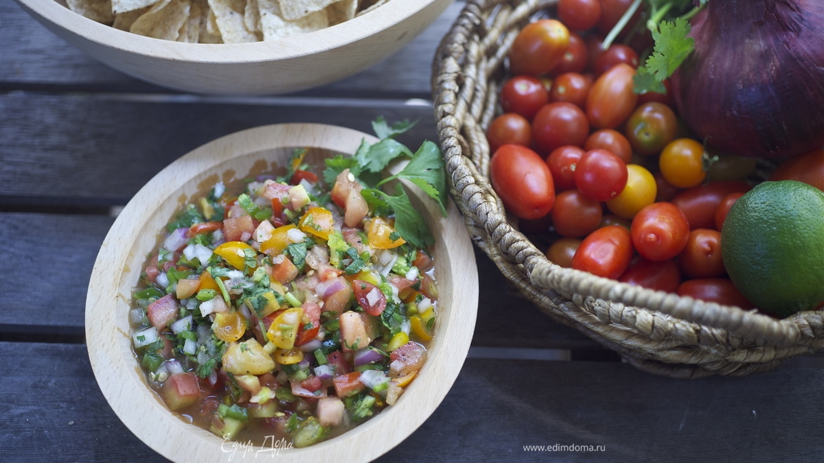 Это один из самых простых вариантов сальсы что может быть! Подаётся с чипсами из лепешки тортилья или к любому горячему мясному блюду как гарнир. Прелесть этой сальсы в том, что всё можно сделать быстро дома и все ингредиенты свежие и полны витаминов!!