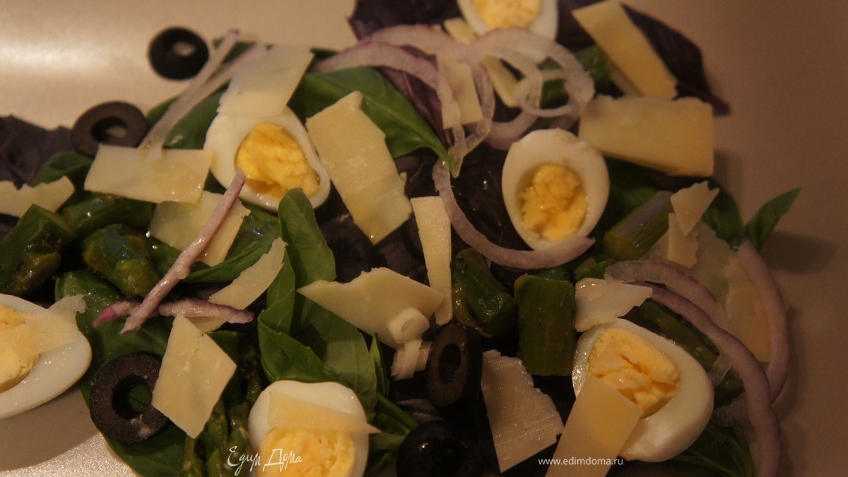 - Шаг 1Отварить перепелиные яйца. Порезать на половинки. Посыпать желток соль. Тушить спаржу с водой и маслом, солью и травами. Дать остыть. Разложить на листья базилика яйца, маслины, фиолетовый лук, порезанную спаржу, тонко порезанный пармеджано, посыпать орегано и полить оливковым маслом.