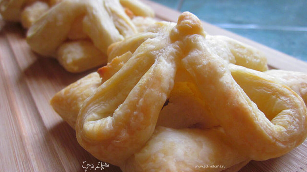 - Шаг 1Готовое тесто слоёное не дрожжевое, разморозить, порезать на квадраты, примерно 10х10. Каждый уголок, отступив от края сантиметр надсечь г-образно, длинна насечки около 3 см. Положить в середину начинку, у меня это творожные ванильные сырки, скрепить противоположные уголки и запечь в духовке при температуре 170 гр. минут 15-20. Очень нежные и вкусные!