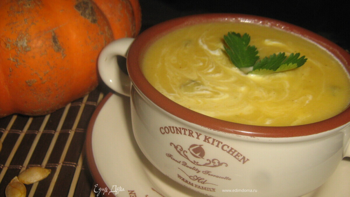 Довести до кипения,добавить тыкву с грушей,снять с огня и пюрировать суп с помощью блендера.Вернуть на огонь,довести до кипения