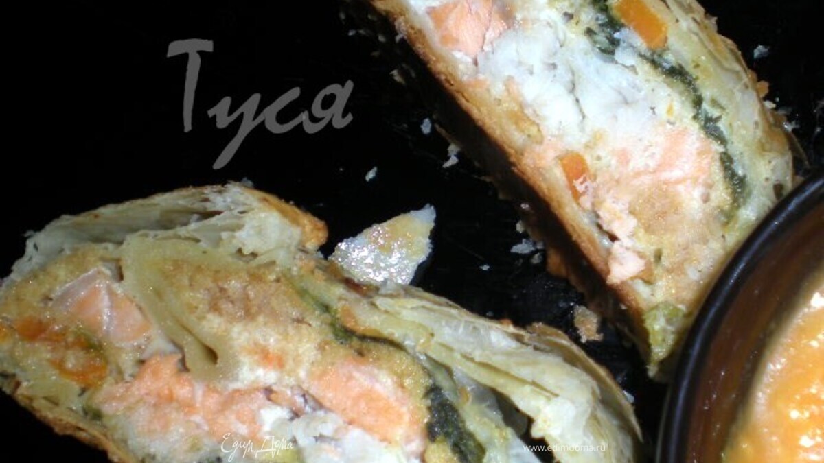 - Шаг 5Положить рыбу вдоль и закатать тесто в плотный рулет.