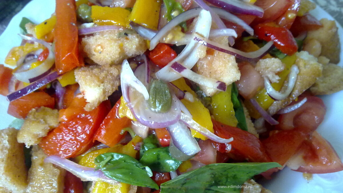 Хлебный тосканский салат с помидорами и перцем (panzanella)