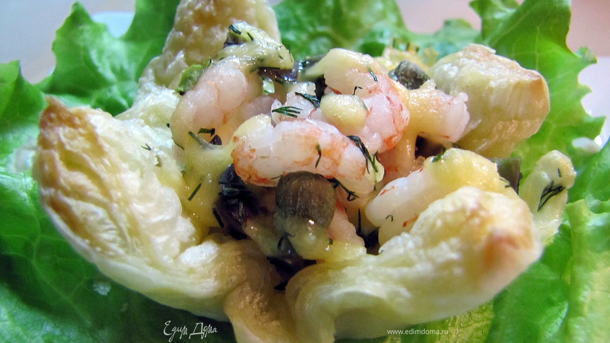 Слоеные корзинки с креветками, каперсами и авокадо.