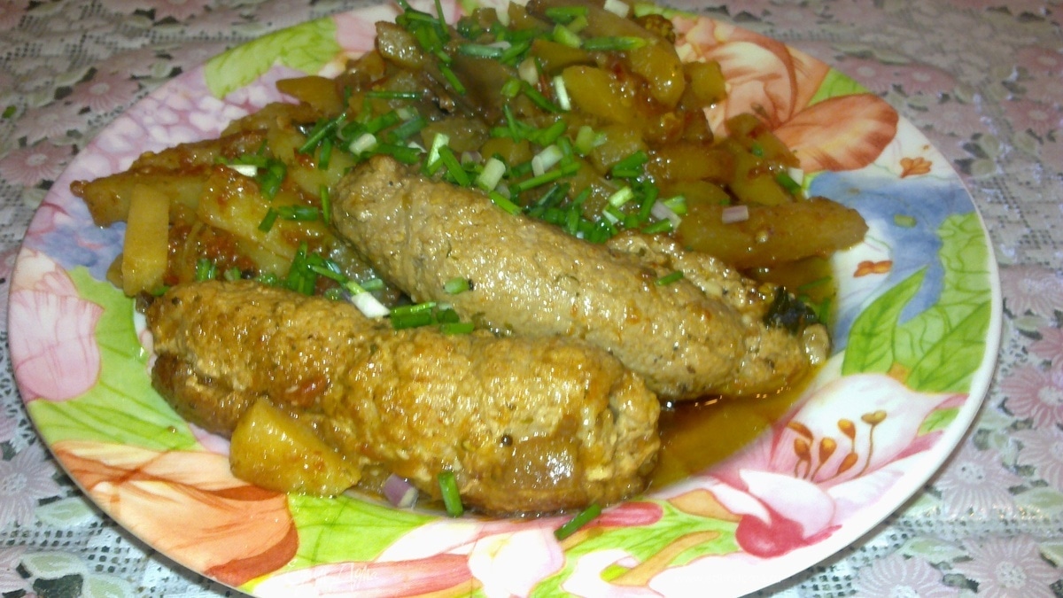 - Шаг 2На тонко отбитые порционные куски мяса положите фарш и сверните изделия в виде колбасок.Подготовленный полуфабрикат посыпьте солью,перцем,обжарьте и уложите в кастрюлю.Сверху положите мелко нарезанный,предварительно обжаренный картофель,залейте соусом и тушите 30 мин. Приятного аппетита.