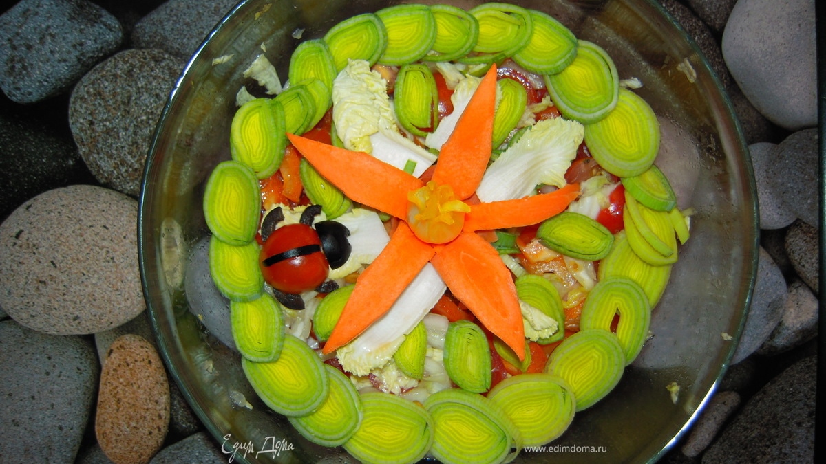 Во втором варианте обычный овощной салат украшен луком порей, помидором черри с маслиной и морковкой с серединкой обычной луковицы, вымоченной в куркуме для цвета.