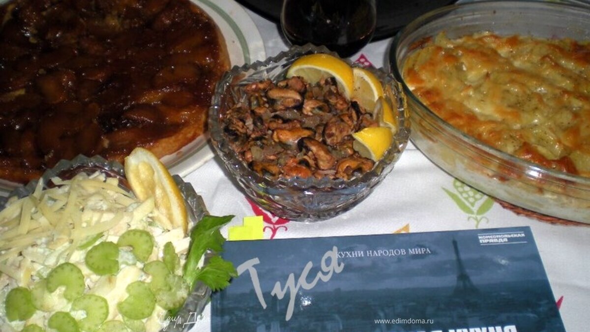 Думала,думала чем сегодня накормить семью,посмотрела что есть в наличии,полистала книжки и решила ,что некоторые рецепты из французской кухни я осилю... Первым слепила ТАРТ ТАТЕН (рецепт писать не буду т.к.думаю на сайте уже такой присутствует)Для меня это главное блюдо,без него и Франция,не Франция)))Пока он стоял в духовке я приготовила салатик: