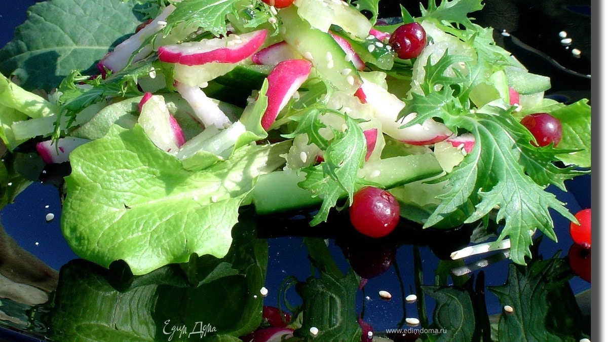 Черешковый сельдерей нарезаем пластинками,огурцы и редис брусочками. Листья салата, руколу перемешиваем с сельдереем,огурцами,редисом и клюквой. В оливковое масло добавляем бальзамический уксус,перемешиваем и заправляем салат. Сверху посыпаем кунжутом. Приятного аппетита! - Шаг 2