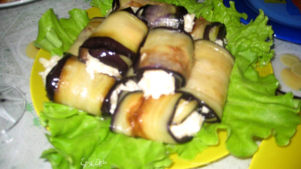 - Шаг 1Баклажан нарезать "повдоль" на полоски,посолить и обжарить на раст.масле до золотистого цвета. Сыр натереть на тёрке,выдавить туда чеснок,если есть рубленную зелень(укроп или петрушку) и всё перемешать с майонезом. Завернуть сырную начинку в баклажаны.Подавать на блюде,выложенном салатными листьями!Приятного аппетита:)