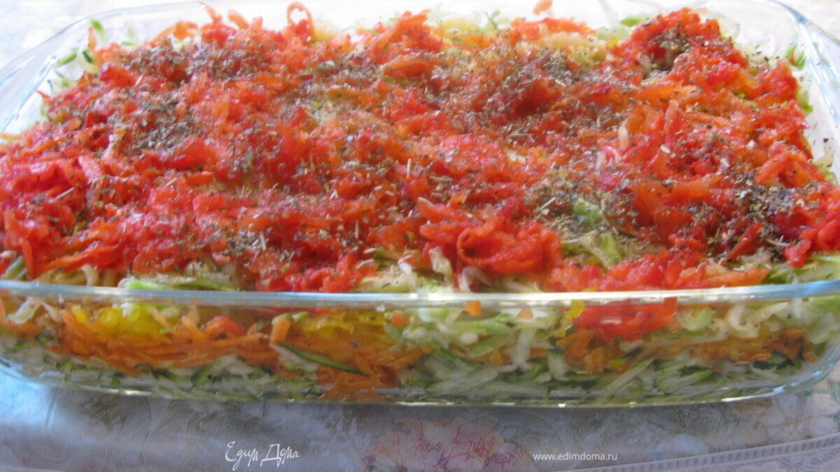 Все овощи натереть на крупной терке, выложить слоями в форму (без масла). Каждый слой слегка присолить и приправить травками на ваше усмотрение. Сверху побрызать слегка маслом и бальзамиком, закрыть крышкой или фольгой и отправить на 50-60 мин в духовку. Минут за 20 до конца открыть, можно посыпать тертым сыром6 лио добавить маленькие кусочки козьего сыра.