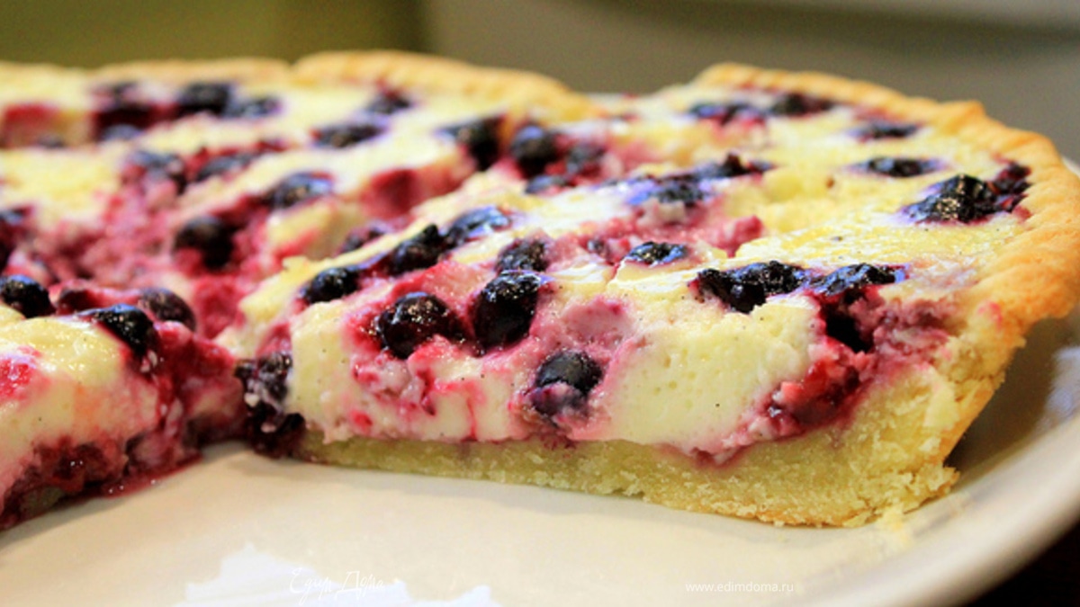 Чернику и клубнику разморозить в холодильнике. Сметану хорошо перемешать с сахаром, яйцами и мукой (крахмалом). Тесто смазать мандариновым конфитюром, на него вылить сметанную начинку, сверху выложить ягоды.
