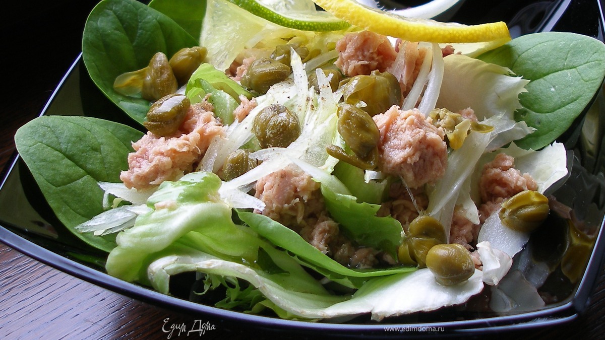 - Шаг 1Салат вымыть, высушить и положить в салатницу.Сверху выложить кусочки тунца, каперсы, нарезанный полукольцами лук. Посолить, поперчить, сбрызнуть соком лимона и оливковым маслом. Украсить дольками лимона и лайма.