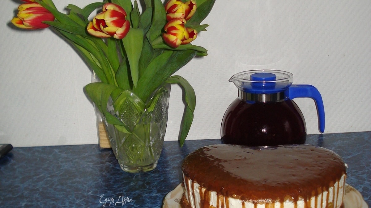 - Шаг 6Сверху распределить остатки крема, накрыть вторым коржом и поставить в холодильник часов на 6 (лучше на ночь)