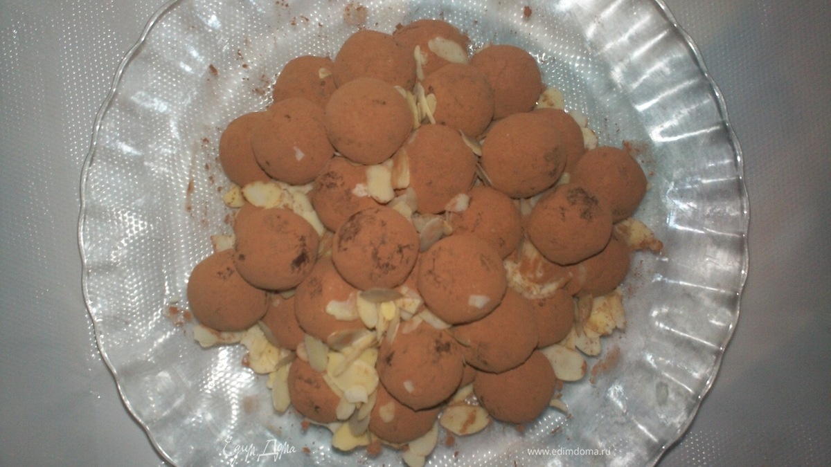 Обвалять каждую конфетку в какао со всех сторон и выложить на блюдо. Посыпать сверху миндальными хлопьями.