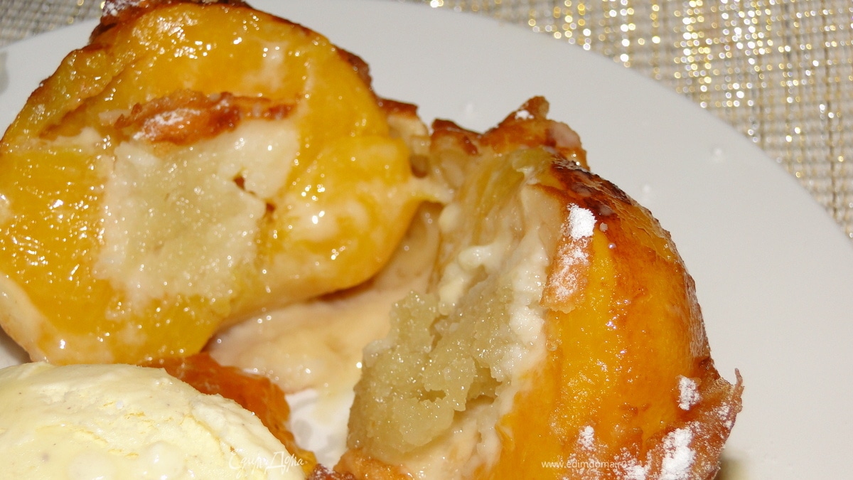Окунать в кляр и жарить в большом кол-ве растительного масла до золотистого цвета. Вынять на бумажнуя салфетку.Дать немного остыть, посыпать сахарной пудрой. Подавала с ванильным мороженым и абрикосовым джемом