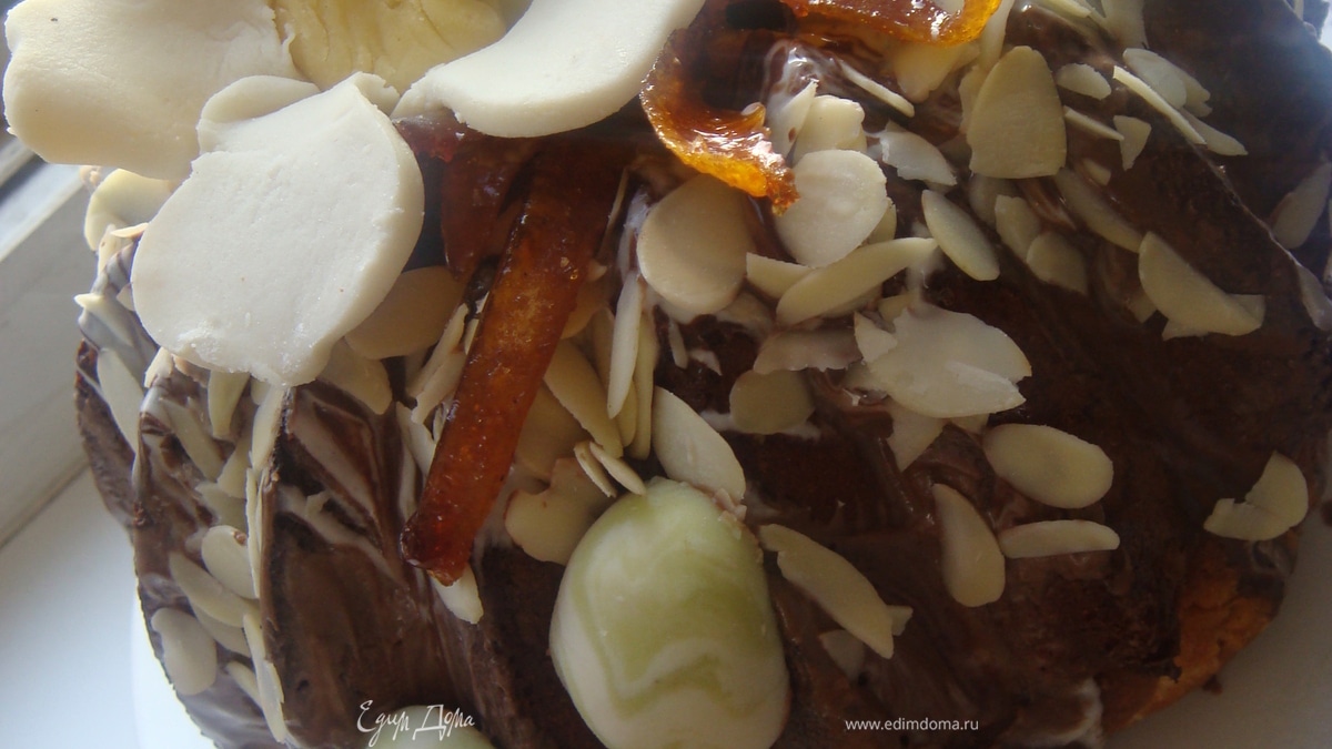8.Теперь подготовим глазурь и перейдем к украшательствам :). Темный и белый шоколад поместить по пакетам для запекания-отдельно и растопить в горящей воде. Добавить в каждый пакет мало-хорошо встряхнуть до растворения масла. Сделать на пакетах надрезы и заливать кулич слоями-сначала по кругу темный шоколад,сверху по кругу белый и опять чередовать-получается "зебра"-очень эффектно! Обсыпать верх кулича миндальными хлопьями.