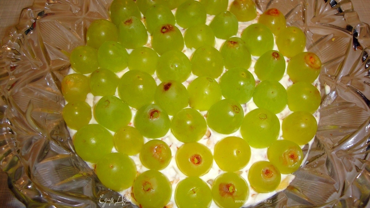 - ПодготовкаСлои: 1 - куриное мясо + майонез 2 - тёртый сыр + майонез 3 - куриное мясо + майонез 4 - яйца + майонез 5 - миндаль + майонез 6 - виноград