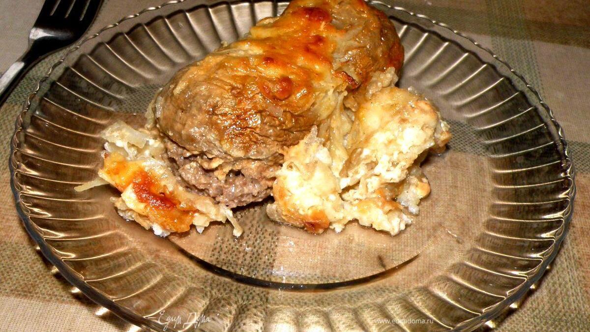 Режем луковицу на пополам. Первую половинку, тонкими полукольцами пускаем на фарш. В фарш добавляем розмарин, соль и перемешиваем. Картофель натираем на крупной терке, добавляем яйца, сметану соль. Начиняем шампиньоны фаршем. - Шаг 3В сковороду для выпивание (с толстыми краями) наливаем масло. Шампиньоны выкладываем фаршем вниз, и закрываем картофелем, натираем сыр и ставим в духовку на средней огонь на 50 - 60 минут. Приятного аппетита!