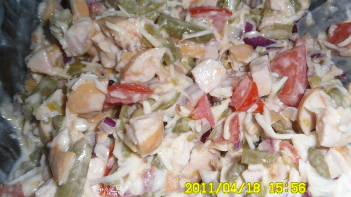 Отварите сосиски, нарежьте их кубиками. На средней терке натрите сыр, нарежьте лук (можно и его натереть). Далее — помидор, фасоль. - Шаг 2Все перемешать и заправить майонезом!