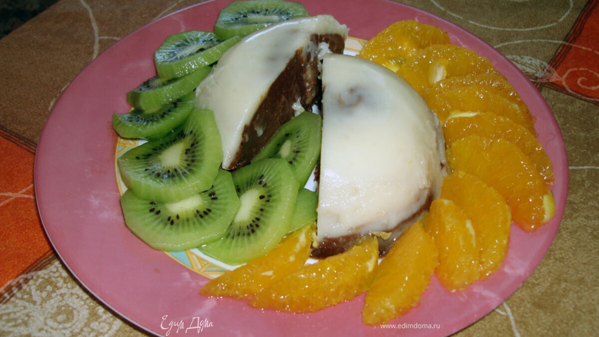 - Шаг 11. Вскипятить 1 стакан молока с 2-мя стаканами сахару. 2. Перемешать с помошью миксера (на средней скорости) 4 яйца, оставшееся молоко, сливки, просеянную муку, соль. Постоянно помешивая венчиком, тонкой струйкой влить эту смесь в кипящее молоко. Прогреть до загустения, но не кипятить. 3. Снять с плиты и добавить предварительно замоченный желатин. Перемешивать до полного растворения желатина. 4. Слегка остудить и вмешать размягченное масло. 5. Часть крема разлить по формочкам. 6. Шоколад разломать на мелкие кусочки, высыпать в оставшийся крем и размешивать до растворения. 7. Разлить шоколадный крем в те же формочки и слегка перемешать, чтобы получился рисунок. Поставить в холодильник. 8. Для подачи на стол выложить крем из формочек на тарелки, украсить фруктами.
