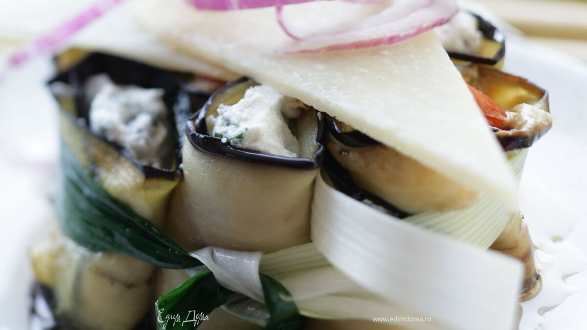 1. Баклажаны вымыть, удалить плодоножку (зеленую часть), нарезать пластинами, похожими на язык, толщиной 3-4 мм (примерно 2 спички), выложить на противень. 2. Свежие помидоры вымыть, нарезать кружочками такой же толщины, уложить на противень рядом с баклажанами. 3. Сбрызнуть овощи растительным маслом и запекать в духовке при температуре 180˚С 30-40 минут, пока овощи не станут мягкими. Если помидоры вяленые, никакой тепловой обработке их подвергать не нужно. 4. Приготовить две смеси: для одной смешать сметану и горчицу, добавить измельченный зубчик чеснока; для другой вилкой растереть брынзу (фету), добавить измельченные грецкие орехи, зелень мяты, тархуна и измельченный зубчик чеснока. 5. Половину запеченных баклажанов смазать сметанно-горчичной смесью, сверху, ближе к краю баклажана, положить запеченный кружок помидора, свернуть рулетиком и оставить на противне. На оставшиеся баклажаны, ближе к краю, выложить сырно-ореховую смесь и тоже скрутить в рулетики. 6. Листья лука-порея ошпарить кипятком и разрезать вдоль на несколько полосок шириной 1-1,5 см. Получившимися ленточками связать вместе по 5-6 рулетиков. 7. Сыр натереть на терке. На сковороду (которую можно ставить в духовку) или противень выложить лист бумаги для выпекания, сверху по поверхности листа распределить натертый сыр так, чтобы получилась лепешка с небольшими дырочками, и запекать в духовке 10-15 минут при температуре 200˚С, затем вынуть и остудить. 8. Остывшую сырную лепешку нарезать на треугольники так, чтобы каждый из них мог накрыть сверху связку баклажанов. Выложить на тарелку баклажаны, сверху сыр, затем нарезанный кольцами розовый лук. Тарелку предварительно можно украсить листом салата и помидорками черри.