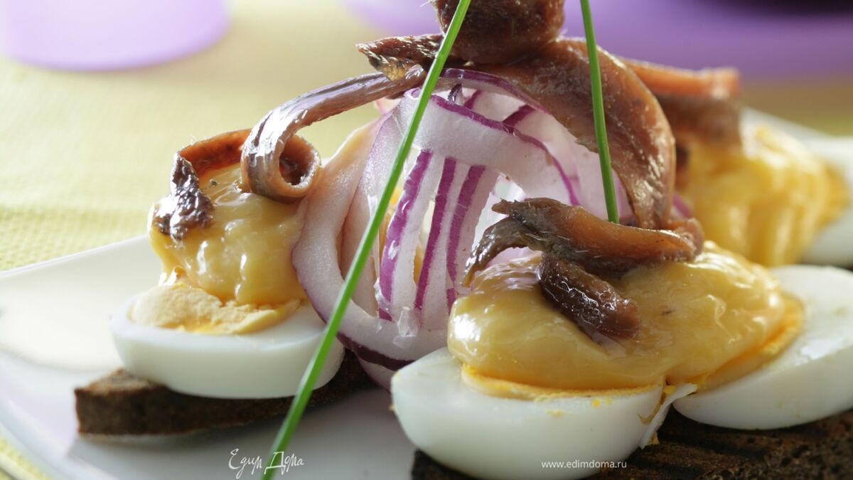 - Подготовка1. Яйца тщательно вымыть теплой водой, желательно с содой, и отварить в воде с добавлением соли (чтобы скорлупа не потрескалась). Для того чтобы яйца сварились вкрутую и желтки остались желтыми, достаточно варить их 10 минут после закипания, а затем залить холодной водой и подержать в ней минут 10-15. 2. Для соуса взбить в блендере сырой желток с горчицей добела, затем постепенно вводить тонкой струйкой масло, не переставая взбивать. Когда получится густая маслянистая и однородная масса, ввести сок лимона, добавить лук, филе анчоусов и ворчестер, измельчить все до однородного состояния. 3. Сваренные яйца очистить от скорлупы, разрезать на половинки (интереснее даже на четвертинки). Желтки вынуть, мелко покрошить, добавить в соус и начинить дольки белка полученной смесью. Сверху яйца можно присыпать нарезанным зеленым луком.