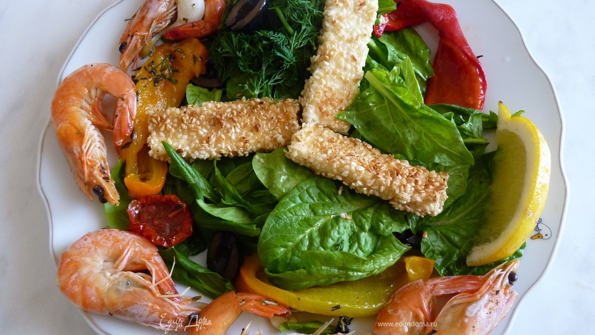 Салат с запечённым перцем, сыром фета и креветками