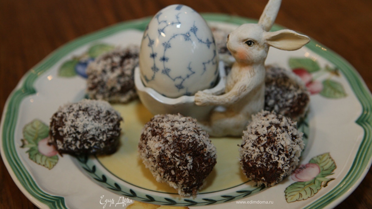 Обмакнуть остывшие шарики в шоколад, затем обвалять в оставшейся кокосовой стружке и отправить еще на пару часов в холодильник.