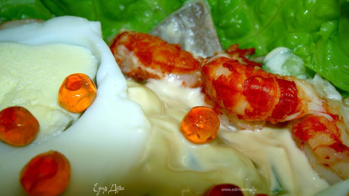 И полейте этой смесью салат. Поверх соуса аккуратно "рассыпьте" красную икру и ещё немного каперсов.Украсьте, красиво разложив по краям отваренные и почищенные раковые шейки, порезанные пополам отваренные вкрутую яйца, листья зеленого салата. Повторимся - подавать "Оливье" следует очень холодным.