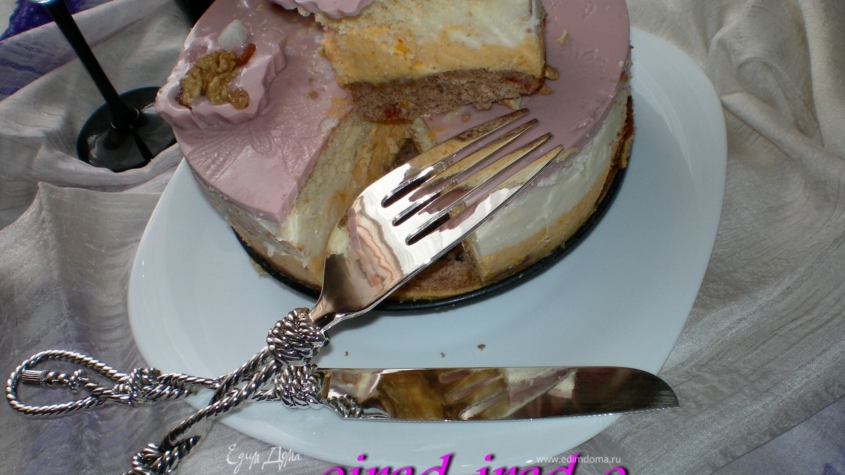 И в самом конце вылить вишневый крем .Для украшения торта по верх начинающего желироваться крема уложить кружевную материю на 15 мин ,после убрать. - Шаг 26