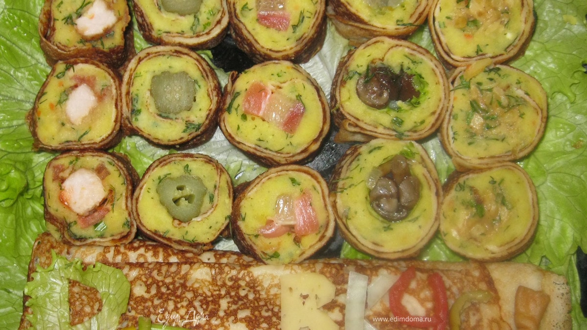 - Шаг 1Ставлю картошку на огонь, разогреваю сковородочку и замешиваю жидкое тесто из пшеничной муки, яичка и молока со щепоткой соли. Тихо шкворчит подсолнечное масло, тесто легко растекается по сковородке. Ладные блинчики получаются, тоненькие с дырочками и даже первый не комом. Складываю их стопкой и каждый смазываю сливочным маслом. Картошка уже кипит, сделаю из нее пюре. Нет, блендер не беру, мну ручной толкушкой, а чтобы пюре получилось нежное, без комочков, кладу в него сливочное масло, слегка подсаливаю и, конечно же, от души насыпаю рубленый укропчик. Теперь намазываю его на три блинчика. На край первого кладу соленый огурчик, разрезанный на четвертинки повдоль. На второй маринованные грибочки с рубленым луком, а на третий соленую форель с тоненькими кусочками лимона. Сворачиваю блинчики трубочкой и нарезаю ролы. Много получилось, понадобится большая тарелка. Ну что, ребята, завтра выходной, сегодня можно выпить! В холодильнике водочка стоит, да и закуска уже готова. Хорошо пошла, а суши очень даже вкусные. Мне особенно понравились ролы с форелью. Ну и умные эти Японцы, такую вкуснятину придумали. Не прошло и минуты, а тарелка уже пустая. Ничего, сейчас еще сделаю, вон в глиняной миске осталось говяжье рагу с помидорами, а еще домашняя, квашеная капустка с клюковкой. «Что, еще с грибочками? Сделаю». Хороши суши получаются. Наливай!
