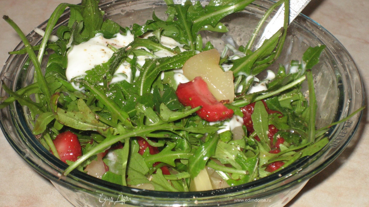 - Шаг 1На тарелку положить горсть салата. Нарезать четвертинками клубнику. Добавить ананасы. посолить, поперчить. Сверху украсить йогуртом. Всё готово.