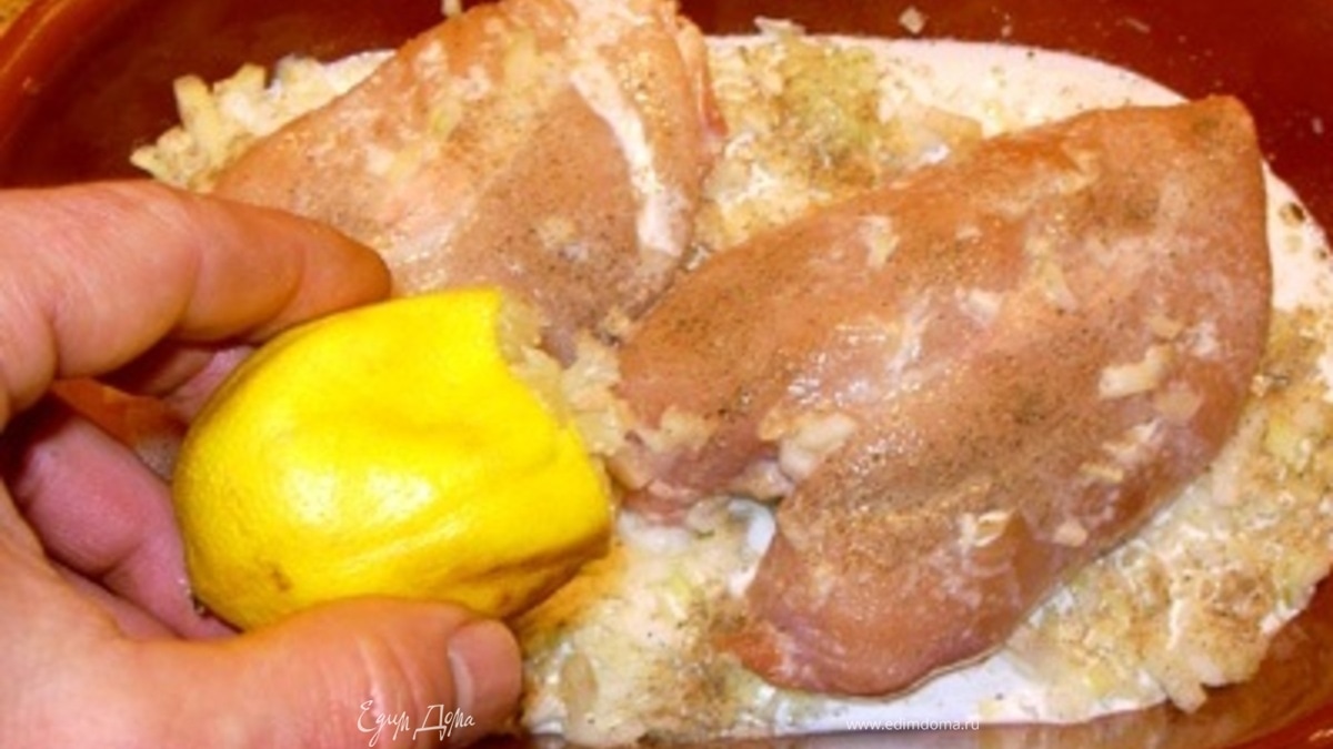 Вливаем граммов 100 нежирных сливок так, чтобы сливки немного покрыли лук. Поскольку мы ведем речь о гамме вкусов, которыми гипотетически должна напитаться наша грудка, выжимаем на сливки один лимон. - Шаг 4