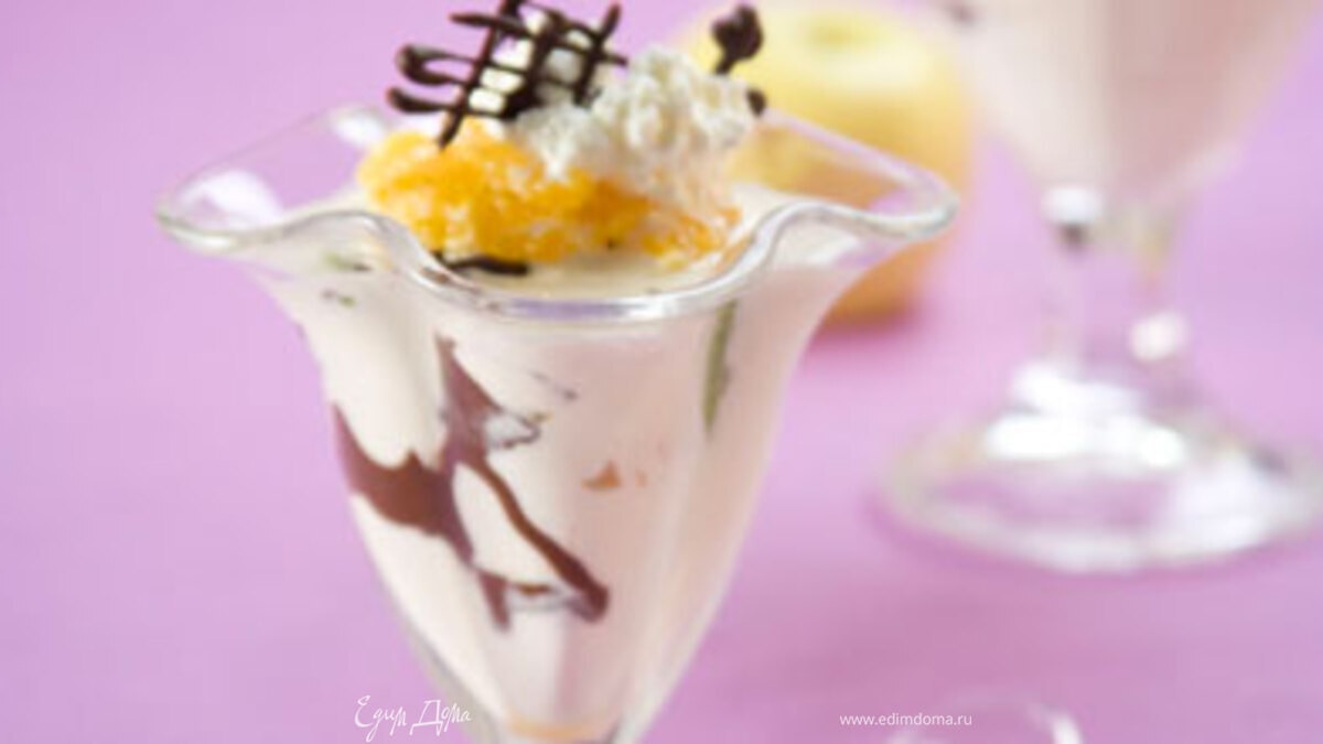 - Шаг 4При подаче оформите десерт взбитыми сливками, фруктами и фигурками из шоколада.