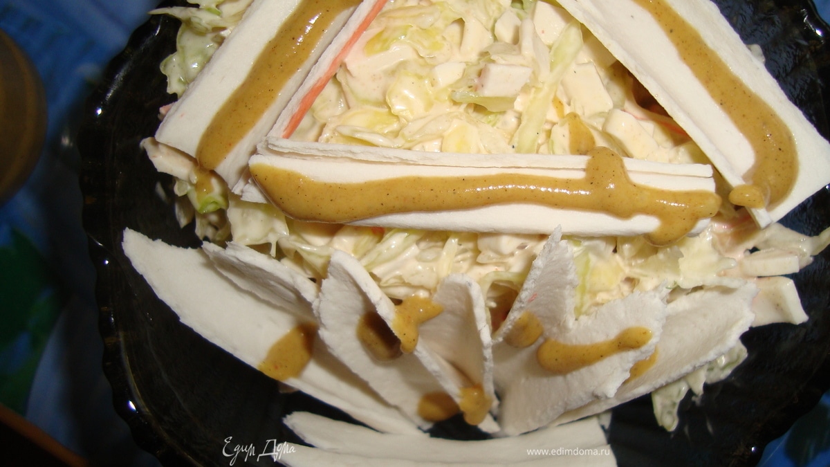 Интересный салат.Некогда непроббывала карусту с крабовыми палочками.