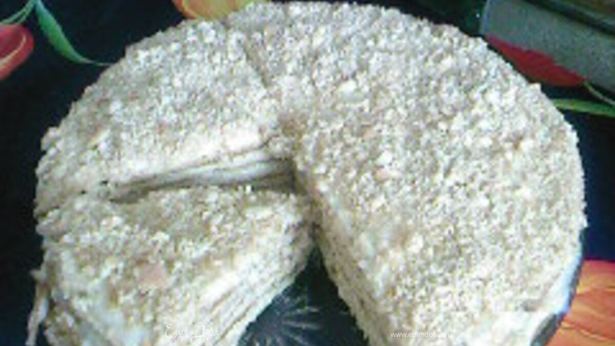- Шаг 3Выпечь тонкие коржи и промазать кремом. Дать пропитаться.