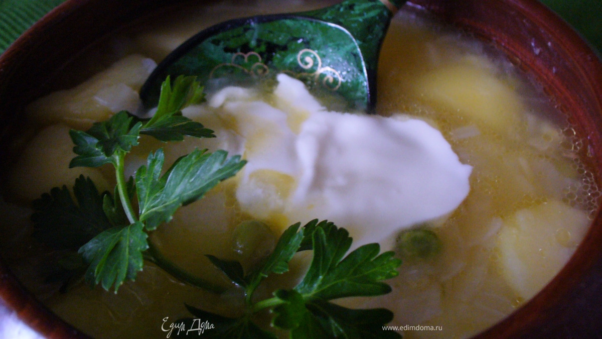 Налить суп в глубокую чашку, добавить сметану, петрушку. Ну а дальше Вы и без меня не растеряетесь. Смачного)