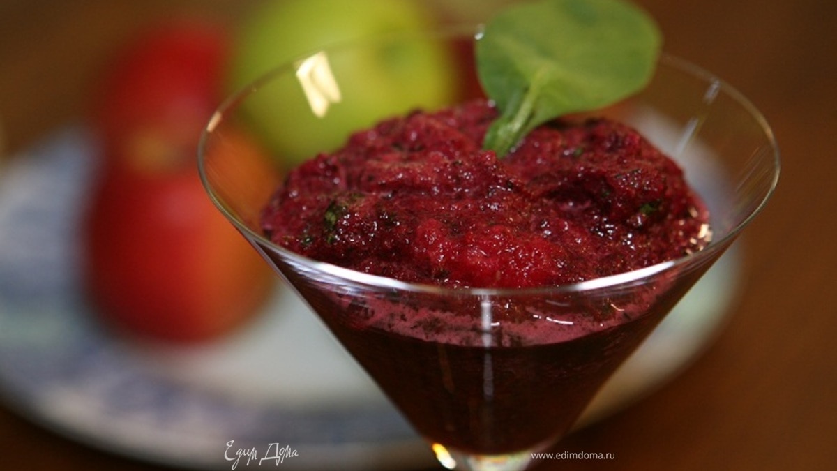 В блендере измельчить свеклу, грушу и шпинат в пюре. Подавать в бокале.