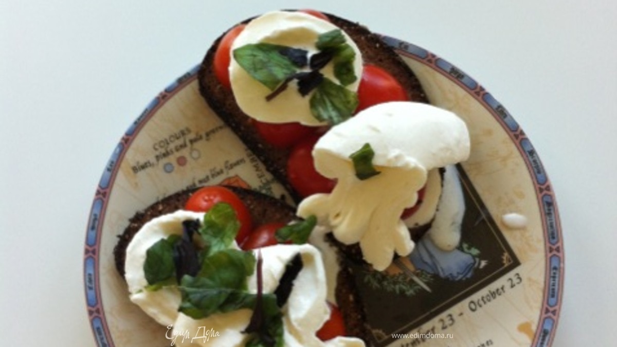 - Шаг 1на хлеб (тост) намазаит мякоть авокадо, сверху выложить колечко помидора (важно чтобы он был не водянистым, и на хлеб с авокадо не растекался) ломтики моцареллы, тонко порезанный базилик 2 х сортов.