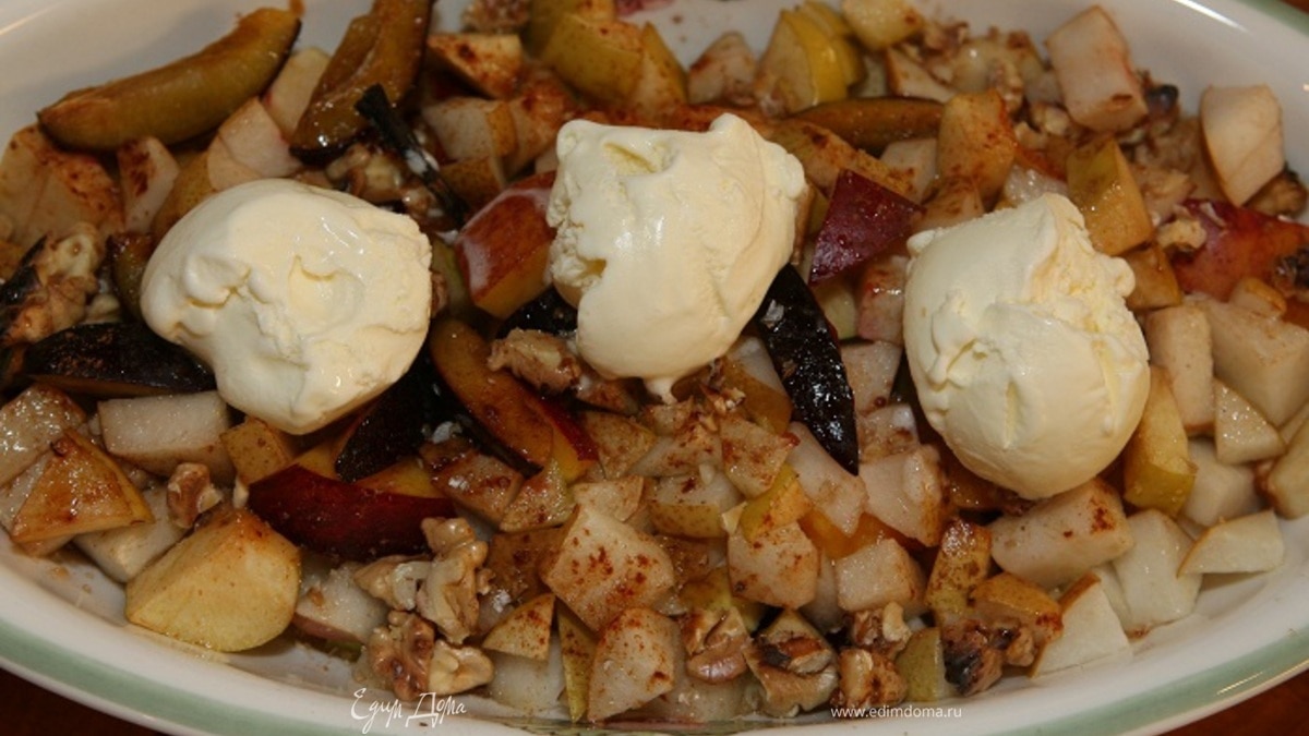 На теплые фрукты выложить несколько шариков ванильного мороженого и сразу подавать.