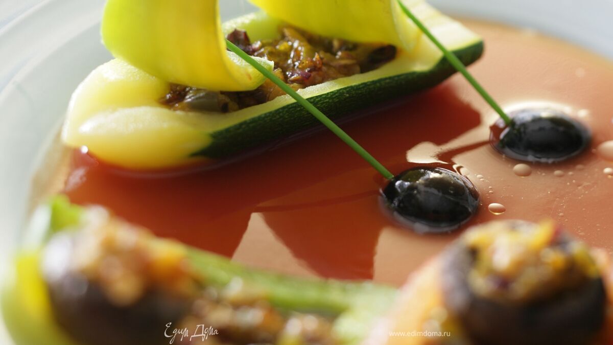 1. Кабачок разрезать вдоль пополам и вынуть ложкой сердцевину, у перца удалить семена и грубые белые части и нарезать его дольками, у помидора аккуратно срезать верхушку и вынуть из него мякоть с соком и семенами, у шампиньона отрезать ножку. 2. Сердцевину кабачка, мякоть помидора, ножку шампиньона и белые грубые части от перца измельчить и обжарить на оливковом масле вместе с мелко нарезанным луком, чесноком, четырьмя маслинами, щепоткой соли и перца до готовности – минут 10. 3. Овощи и гриб начинить получившейся смесью, выложить их в сотейник или кастрюлю, налить примерно полсантиметра воды, добавить томатную пасту, довести до кипения и тушить на медленном огне минут 10-15. 4. Готовые овощи с помощью лопатки аккуратно выложить на тарелку, вылить туда же томатный соус и украсить композицию перьями лука и оставшимися маслинами.