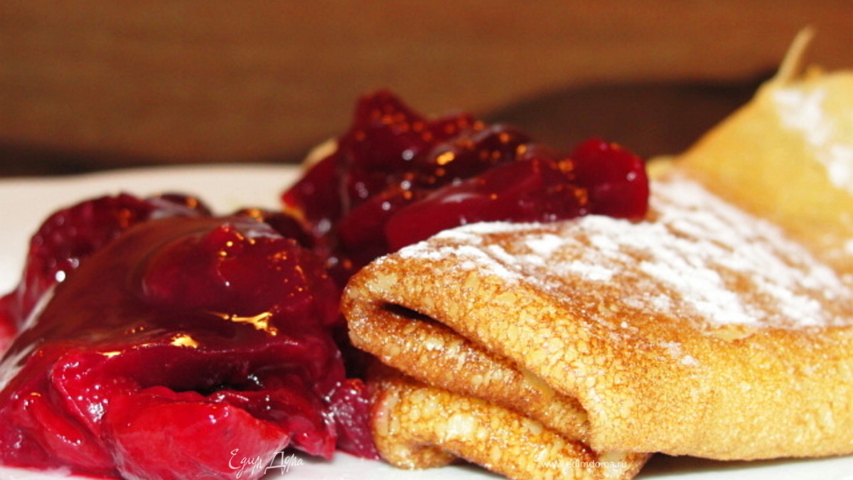 С ягод сливаем сок, доливаем в отмерочном стакане до 500 мл жидкости. 400 мл + 2 ст.л. сахара нагреваем на огне с черешенкой, остальные 100 мл жидкости размешиваем с крахмалом до однородной массы. Вливаем в нагретую ягодную массу и хорошо перемешиваем. Убираем с огня. Получается густой соус к блинчикам. Подаем наши блинчики, сопыпанные сахарной пудрой с соусом. Приятного чаепития!