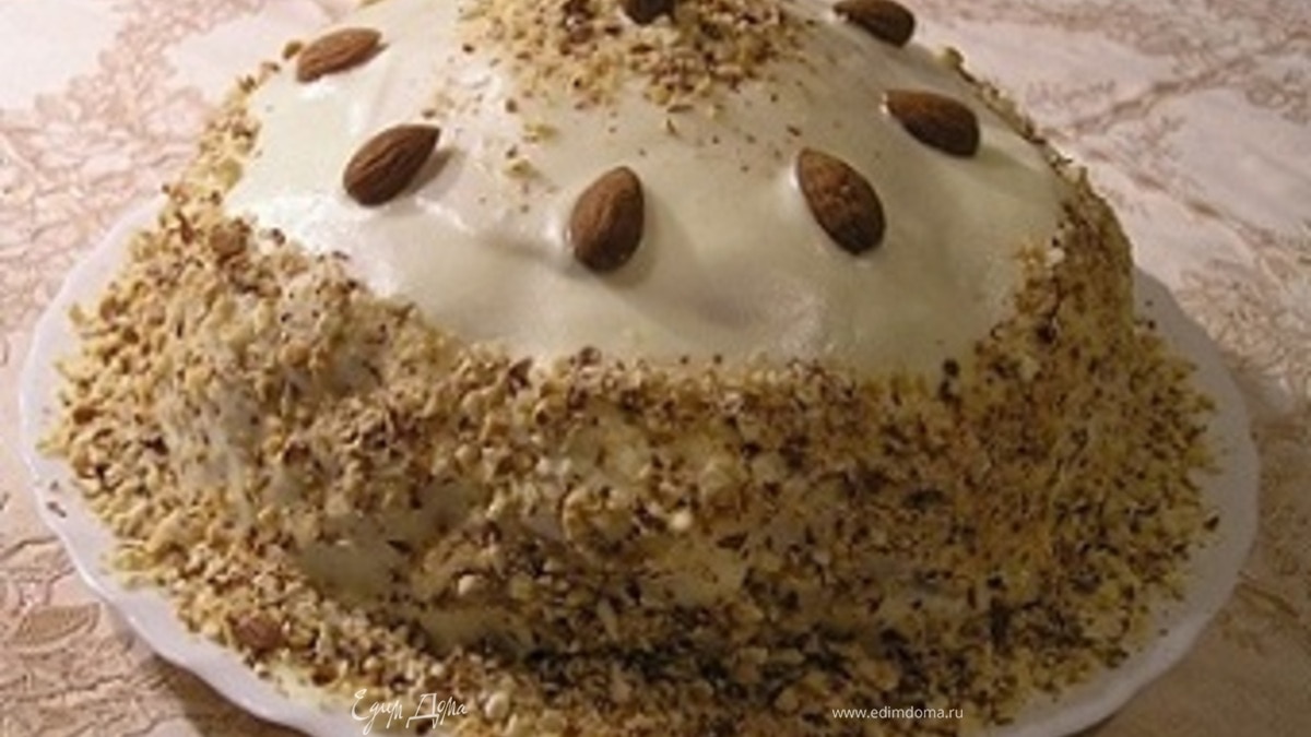 Весь торт обмазать кремом, обсыпать дроблеными орехами и украсить целым миндалем.