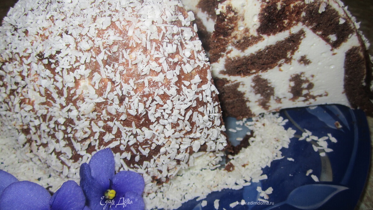 Торт достать из холодильника. Перевернуть на тарелку, снять пленку. Свеху покрыть ганашом и притрусить кокосом. - Шаг 12