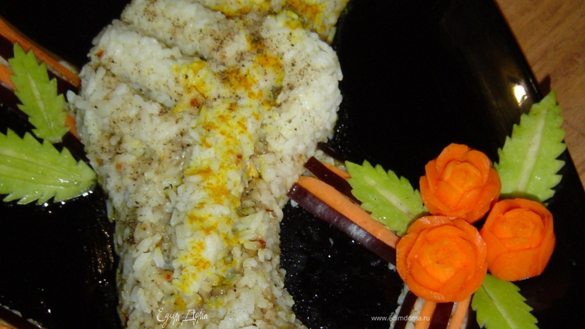 Приготовленную заправку добавляем к рису, и перемешиваем. После этого рис становится очень ароматным и вкусным.Когда все подготовительные работы окончены, приступаем к сборке салата. Первым слоем будет рис, его мы выкладываем в форме руки, держащей факел. - Шаг 6