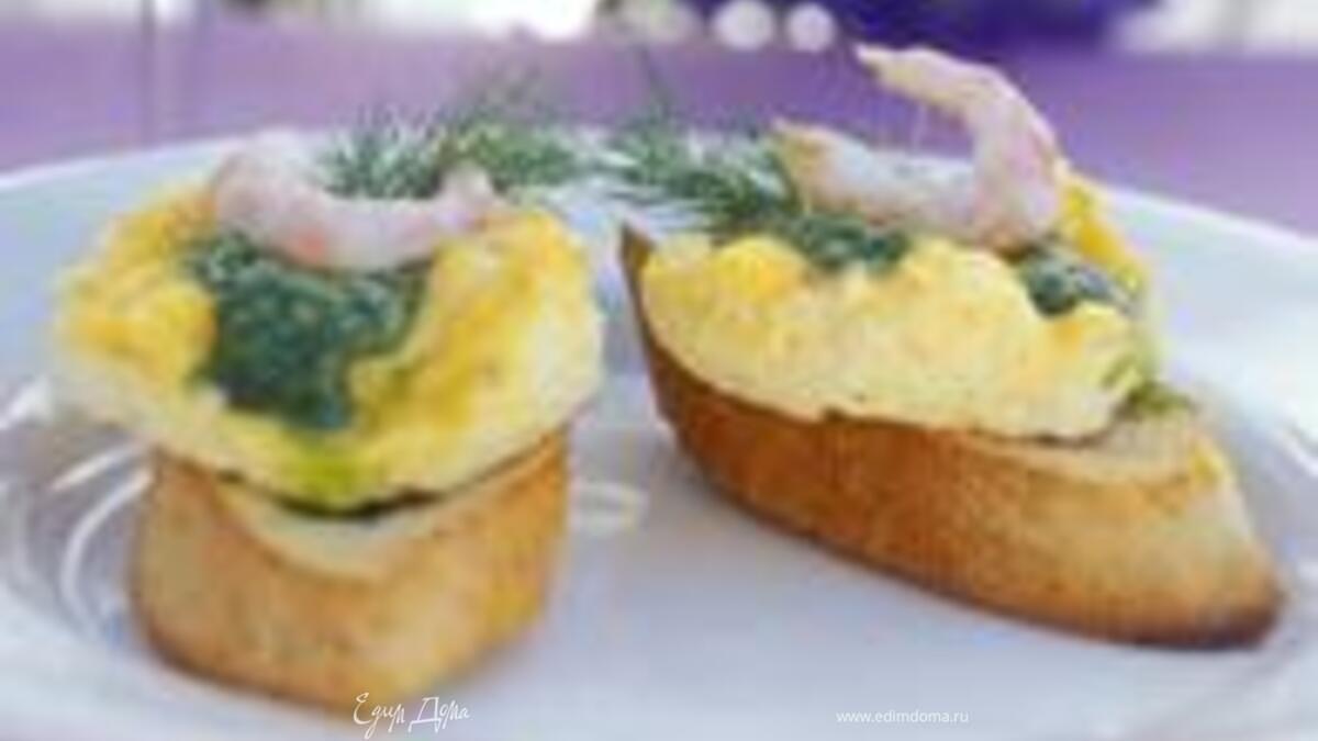 - Шаг 1соединить яйца,тёртый сыр,зелень и майонез посолить.Из этой массы сделать оладушки.Батон нарезать обжарить на сливочном масле и уложить на него по одному оладушку.Украсить отварной креветкой и зеленью