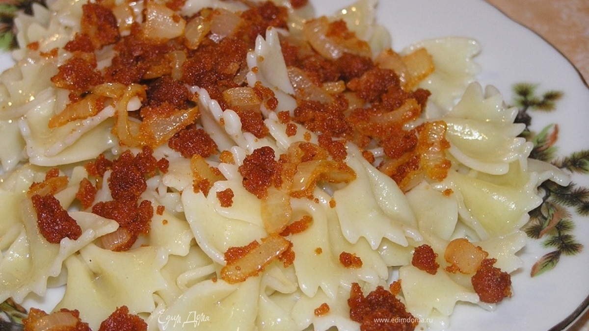 - Шаг 2Приготовить крошки. Шалот измельчить и слегка обжарить на смеси оливкового и сливочного масел. Добавить горсть сухарей, томатную пасту, поперчить и все перемешать. Получатся хрустящие хлебные шарики. Посыпать ими фарфалле.